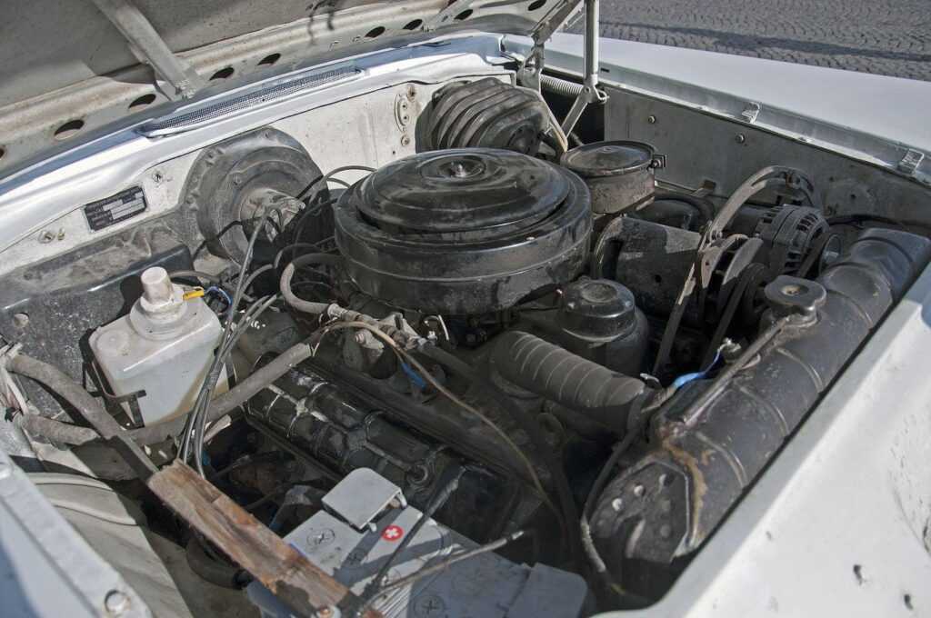 был округлён в меньшую сторону до 88 миллиметров. Рабочий объём при этом сократился до 5529 кубических сантиметров. На самом же деле это был мотор был разработан практически заново. Так, блок цилиндров, и головки, и впускной коллектор, и поршни были выполнены из алюминиевого сплава. По тем временам это было весьма прогрессивным, но довольно редким техническим решением, а в самой Америке первые алюминиевые двигатели появились в начале шестидесятых годов. Лишь сменные мокрые гильзы цилиндров изготавливались из чугуна. В верхнюю часть гильз были запрессованы износостойкие вставки. Коленчатый вал с противовесами, изготовленными заодно со щеками вала, был установлен на пяти коренных подшипниках. Коренные и шатунные подшипники вала имели тонкостенные вкладыши. На каждую шатунную шейку коленчатого вала было установлено по два шатуна. Привод к клапанам двигателя осуществлялся от распределительного вала толкателями, штангами и коромыслами.Хотя мотор и не имел впрыска топлива,