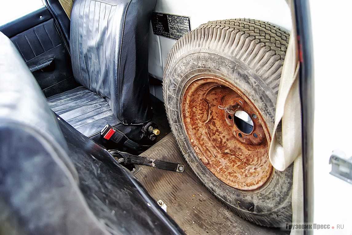 За сиденьем водите… простите, переднего пассажира, на специальном кронштейне смонтировано запасное колесо, а между сиденьями на перегородке видна табличка, установленная британским импортёром, согласно ей, машина именуется не иначе, как «Moskvich 434 Van».