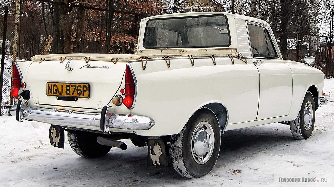 Так как дилерское производство было гибким, даже две стоящих рядом машины заметно отличаются: у восстановленного белого пикапа окно в перегородке «позаимствовано» из задней двери универсала/ фургона, а у голубого пикапа, восстановление которого пока не завершено, оно овальное и меньше размером. Натягиваемый тент крепится на крючки вдоль бортов и закрывает грузовой отсек от посягательств ненастья и нехороших людей. Кстати, тент на белом пикапе – оригинальный, английский, что было весьма приятной неожиданностью на грани чуда: его нашли уже в Москве, в процессе разборки машин перед восстановлением, в скомканном виде под сиденьем.