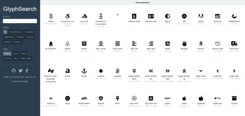 - Glyphsearch – большая библиотека разнообразных иконок, которые скачиваются кодом для загрузки на сайт.