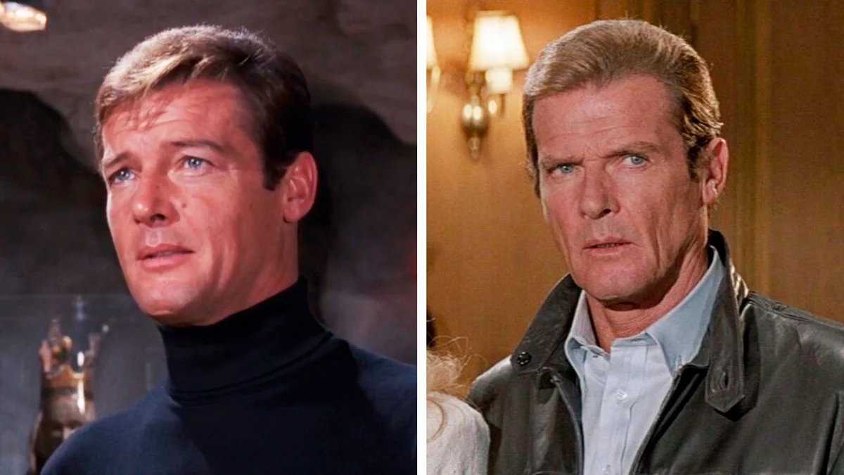 Слева — первое появление Роджера Мура в роли Бонда в фильме «Живи и дай умереть» (1973). А справа — последнее в фильме «Вид на убийство» (1985).