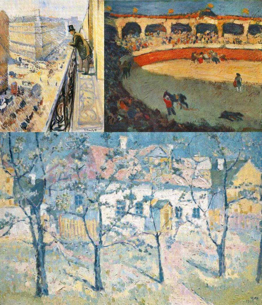 Слева: Эдвард Мунк “Улица Лафайет”, 1901 г. Национальная галерея Осло, Норвегия. Справа: Пабло Пикассо “Коррида”, 1901 г. Частная коллекция. Внизу: Казимир Малевич “Весна, яблоня в цвету”, 1904 г. Третьяковская галерея.