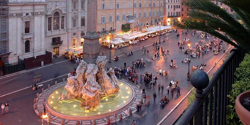 Расположенный в середине фонтана обелиск, демонтированный из древнего храма Исиды, окружают скульптуры мифологических богов. Фигуры символизируют главные реки четырёх частей света: Нил, Ганг, Дунай, Ла-Плата. Композиционное расположение духов, их одеяния, динамичные движения аллегорично представляют истории из древних мифов.
