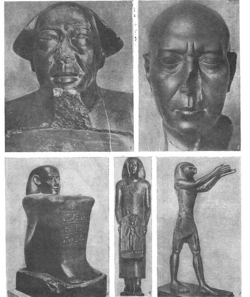 Таблица 71. Скульптура Позднего времени. 1. Голова знатного чиновника, из храма Мут в Карнаке (XXV династия, 0,46 м; каирский музей).— 2. Голова жреца из зеленого шифера (Саисский период, VII — VI вв. до н. э.; высота 0,22 м; эфиопский период, VII в. до н. э.; гранит, высота (Берлин, Египетский музей). — 3. Сидящая фигура (XXVI династия, около 570 г. до н. э., Париж, Лувр).— 4. Статуя жреца(черный базальт; высота 0,68 м; Париж).—5. Бронзовая статуя бога Гора (XXX династия, около 350 г. до н. э., Париж, Лувр).