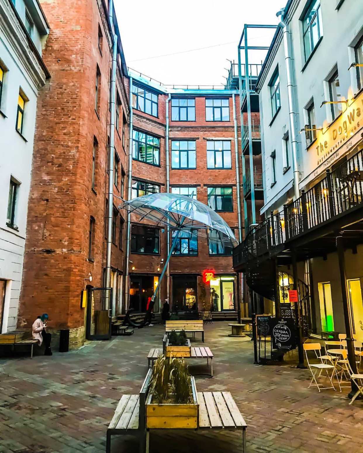 А рядом с галерей искусства на Казанской, вы можете найти Бертгольд центр, который стал еще одним популярным арт-кластером Петербурга. На его территории есть несколько ресторанов и кофеен, магазины с сувенирами и иностранными книгами, а также необычные арт-объекты. Например, гигантский зонтик, который накрывает почти весь дворик Бертгольд центра. Говорят, в народе его прозвали памятником питерскому дождю.