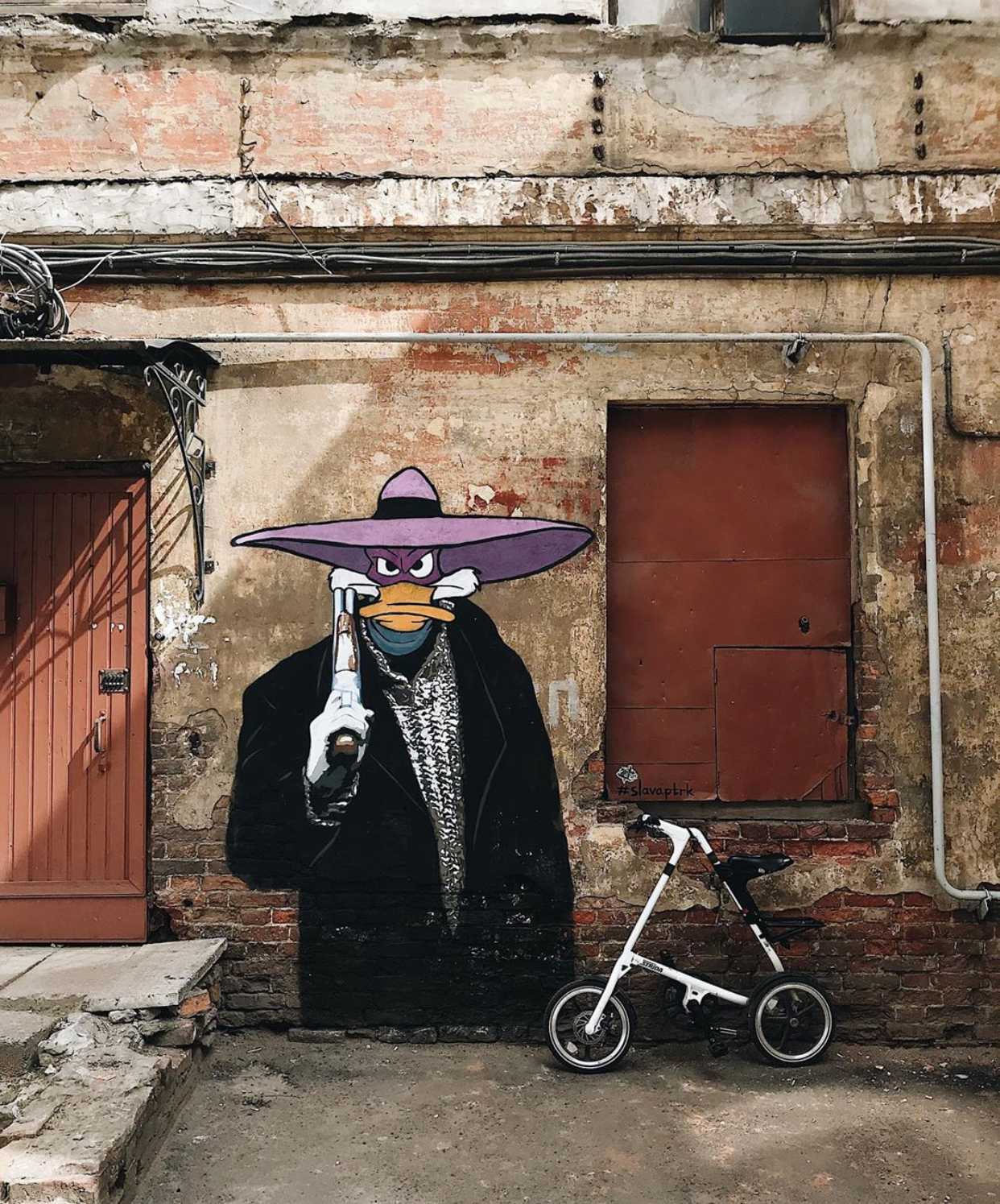 На фасаде одного из домов по улице Марата 78, не так давно появилась работа, которая уже успела захватить инстаграмы петербуржцев – «Мститель в черном». Арт-объект объединил в себе две культовые картины – «Брат» Алексея Балабанова и мультипликационный сериал «Чёрный плащ». Екатеринбургский художник Слава Ptrk выбрал эту локацию не случайно – именно здесь в 1997 году проходили съемки знаменитой картины про бандитский Петербург.