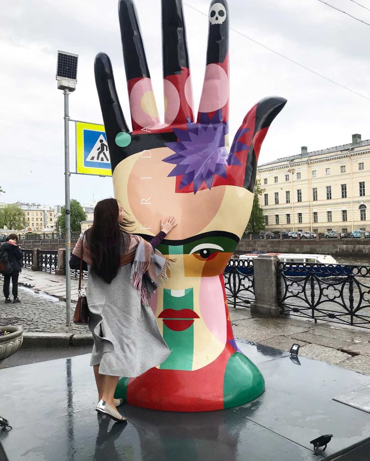 Напротив музея Фаберже, прямо на набережной появилась новая яркая инсталляция – «Рука художника» в честь временной экспозиции музея посвященной мексиканской художнице Фриде Кало. Это работа дизайнеров компании «Айра», которая отражает эмоции и экспрессивную манеру написания полотен художницы.