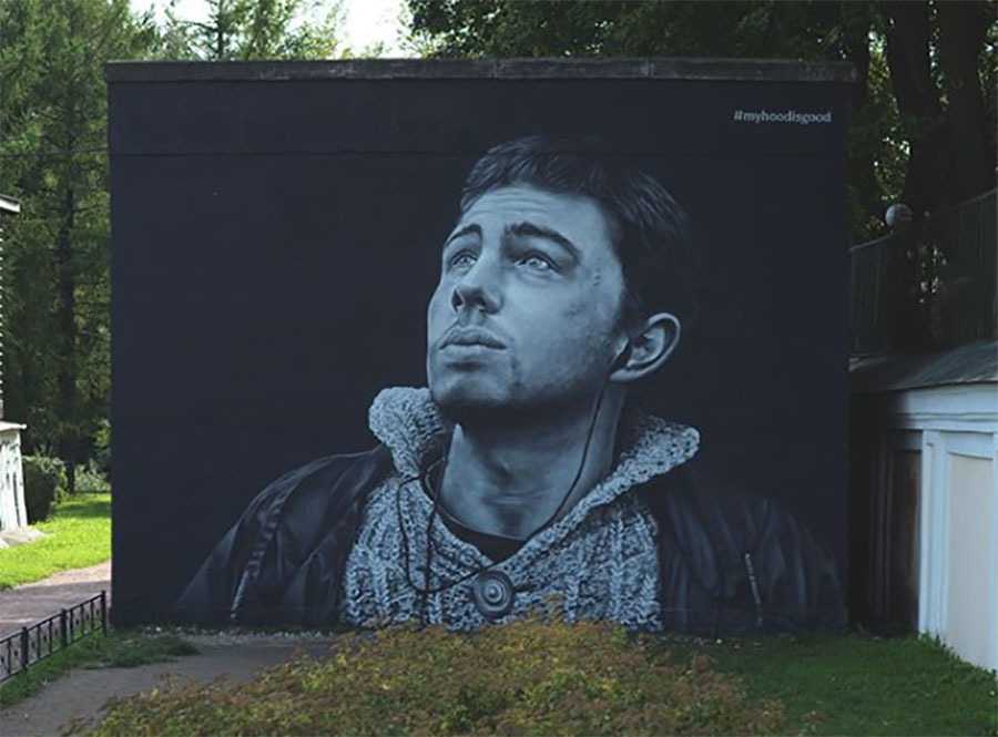 Конечно, если говорить об уличном искусстве Петербурга, первое имя которое всплывает в мыслях – HoodGraffTeam. Эта команда граффитистов за последние несколько лет успела отметится во многих районах города со своими реалистичными портретами знаменитостей. Рядом с портретом художники часто оставляют интересную цитату героя картины, что добавляет смысловую нагрузку этим работам. На Восстания находится одна из самых известных работ художников – портрет Виктора Цоя, который расположен на трансформаторной подстанции.