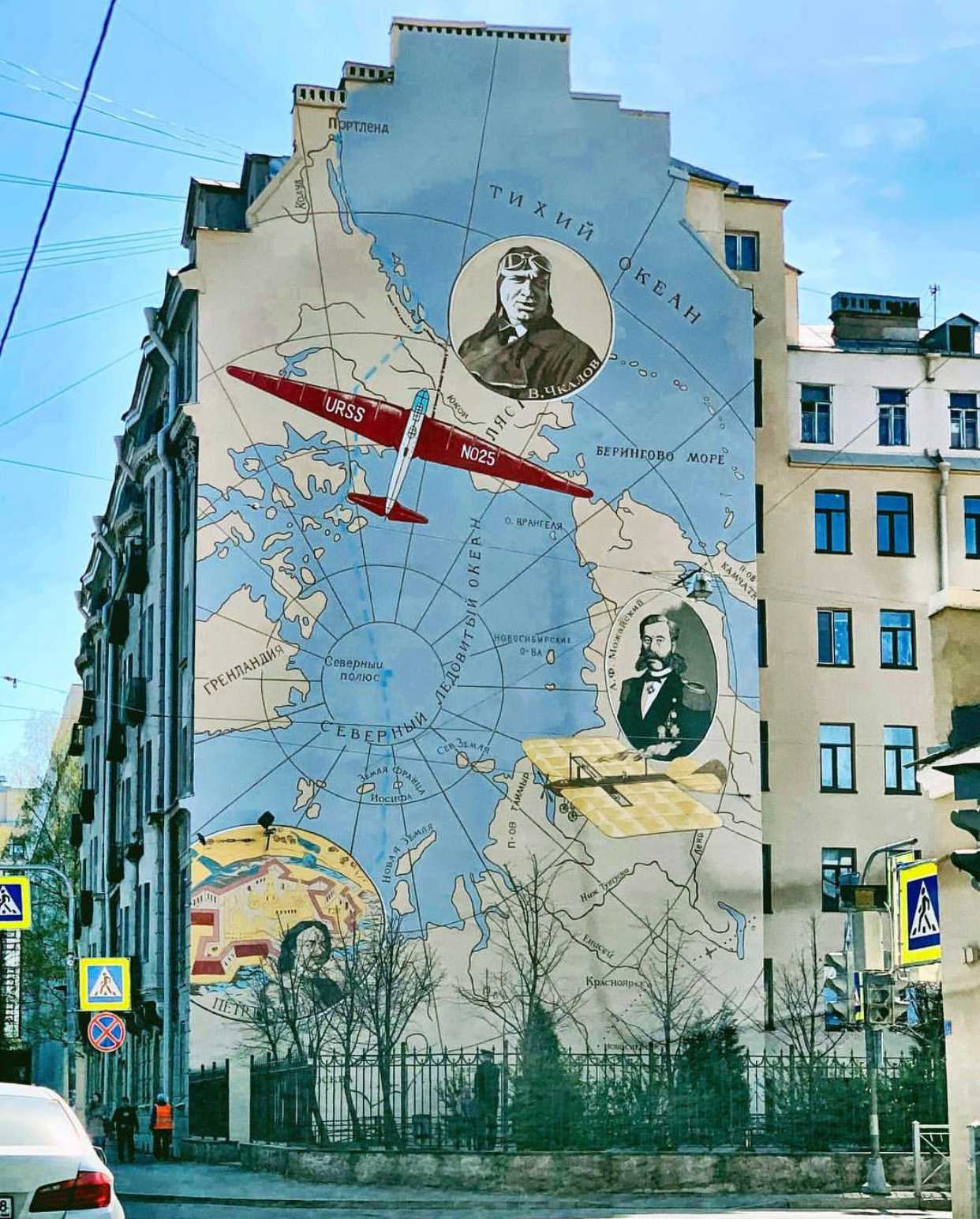 Рядом с метро Чкаловская находится дворик Космонавтов. Стены домов украшены картой созвездий, портретами Гагарина и Чкалова, Королева и Циолковского. Изображен даже Петр I, как никак основатель Петербурга тоже причастен к общему прогрессу.