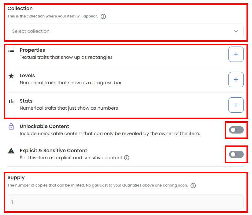 - Supply — Количество экземпляров нашего токена. Если вам необходимо отчеканить токенов больше чем 1, то при создании NFT, добавьте в конец адресной строки ?enable_supply=true. По умолчанию, данное поле отключено.