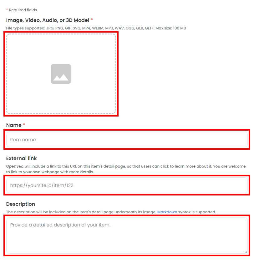 - External link — Внешняя ссылка. OpenSea разместит эту ссылку на странице с элементом, чтобы пользователи могли кликнуть по ней и узнать дополнительную информацию о работе. В этом поле, например, можете указать ссылку на личный сайт или пост в инстаграм.