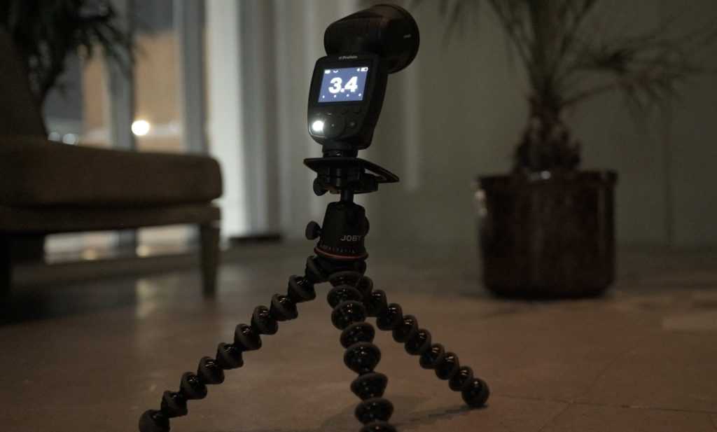 Вспышка была установлена почти на полу на гибком штативе Joby. Это позволило светить снизу вверх и в паре с близким расположением к объекту получить тень значительно превышающую размер самого́ объекта.