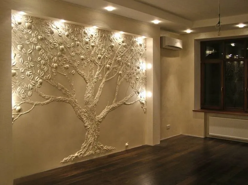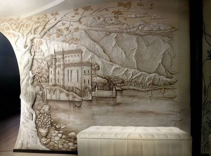 - Текстурная графика, используют для этих целей шпатель и шпаклёвку. Поверхность стены должна быть влажной.