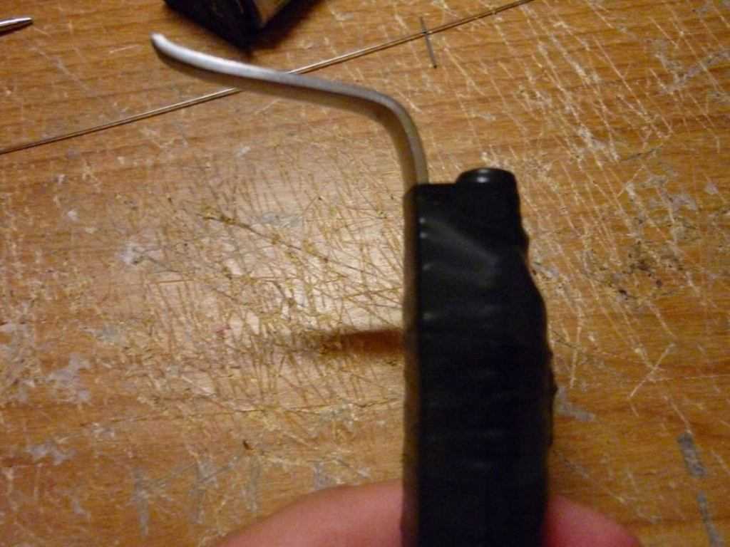 Шаг 3. Делаем скобку из ложки для того, чтобы скрепить между собой мотор и корпус (в качестве которого у нас выступает механический карандаш или ручка). Для этого отламываем ту часть ложки, которой едим, а оставшуюся часть (ручку ложки) сгибаем буквой «Г». Получилась скобка.