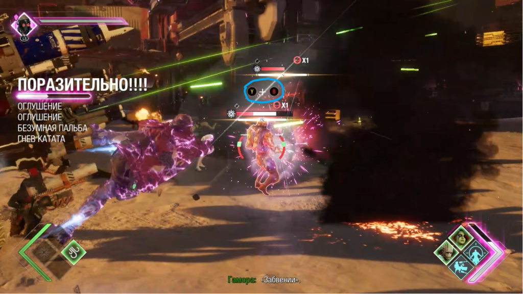 | Убийственная дружбаВыполнить авто-комбо с Гаморой.Надо бить в рукопашную (Клавиша «С»), при этом стоять рядом с Гаморой. | |