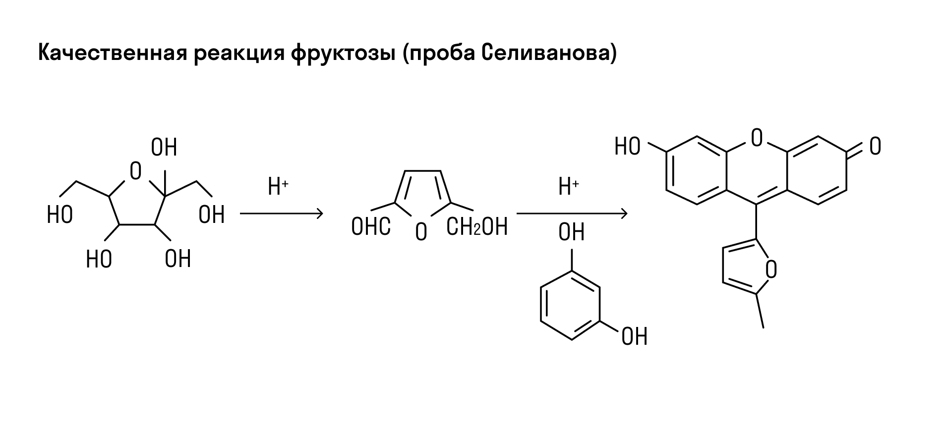 Углеводы с содержанием крахмала можно узнать по синему цвету раствора при добавлении йода. После нагревания такой раствор теряет цвет, но при охлаждении снова становится синим. Фруктозу можно идентифицировать по реакции с резорцином в растворе c соляной кислотой — смесь приобретает вишневый цвет (проба Селиванова).