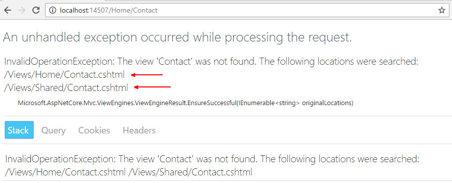 Обратите внимание на то, где система попыталась найти «потерянное» представление, прежде чем выдать сообщение. Такое поведение также предопределено договоренностями фреймворка. В данном случае, правило гласит, что если представление (View) не найдено в папке контролера Home, то следует ее поискать сначала в папке Shared, потом всё то же самое, но уже с другим расширением для другого движка рендеринга (при наличии подключенных нескольких движков рендеринга разметки)