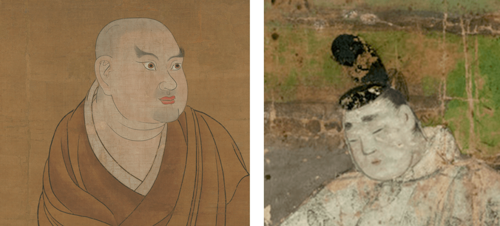Слева: портрет почитаемого монаха периода Камакура (Портрет Цзион Дайси, 14 век, тушь и цвет на шелке, Музей искусств Метрополитен ). Справа: изображение придворного периода Хэйан (фрагмент иллюстрированного свитка «Повести о Гэндзи», XII век, непрозрачные краски на бумаге, Токийский национальный музей).