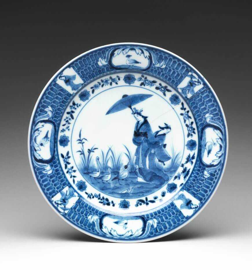 Блюдо с изображением дамы с зонтиком, ок. 1734–37, дизайн приписывается голландцу Корнелису Пронк, фарфор с кобальтово-синим цветом под прозрачной глазурью, 26,7 см