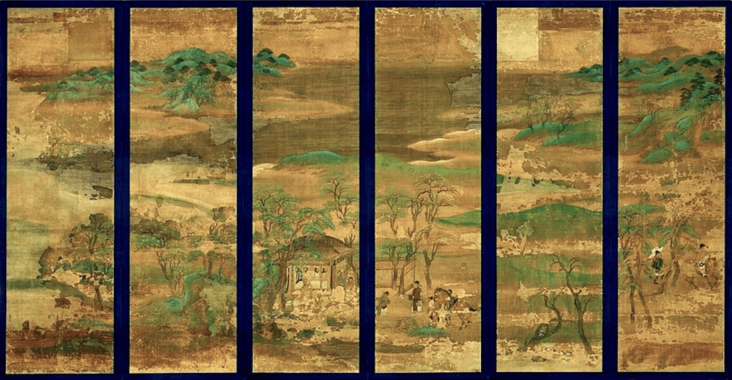 Один из самых ранних образцов пейзажной живописи ямато-э периода Хэйан . 山 水 屏 風(букв. «Складная ширма с изображением гор и воды, шестистворчатая ширма, 11 векПериоды Японии: фотографии храмов и предметов искусств периодов Асука, Нара, Хэйан
