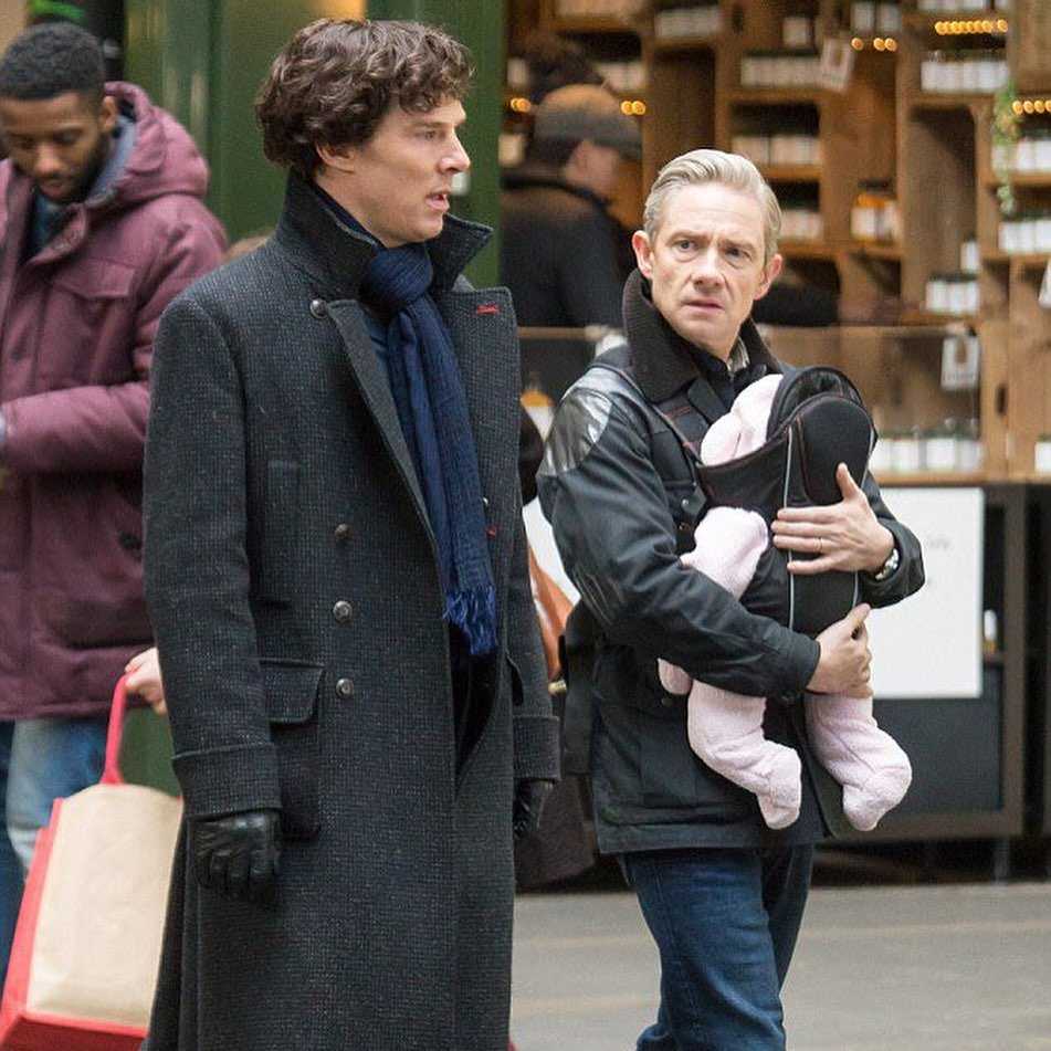 Мартин Фримен с актером Бенедиктом Камбербэтчем. Кадр из телесериала «Холмс»