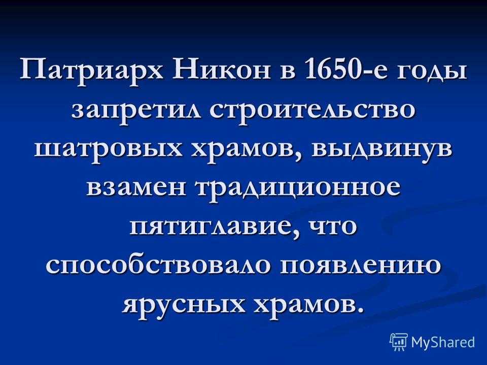Патриарх Никон в 1650-е годы запретил строительство шатровых храмов, выдвинув взамен традиционное пятиглавые, что способствовало появлению ярусных храмов.