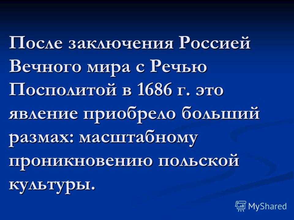 После заключения Россией Вечного мира с Речью Посполитой в 1686 г. это явление приобрело больший размах: масштабному проникновению польской культуры.