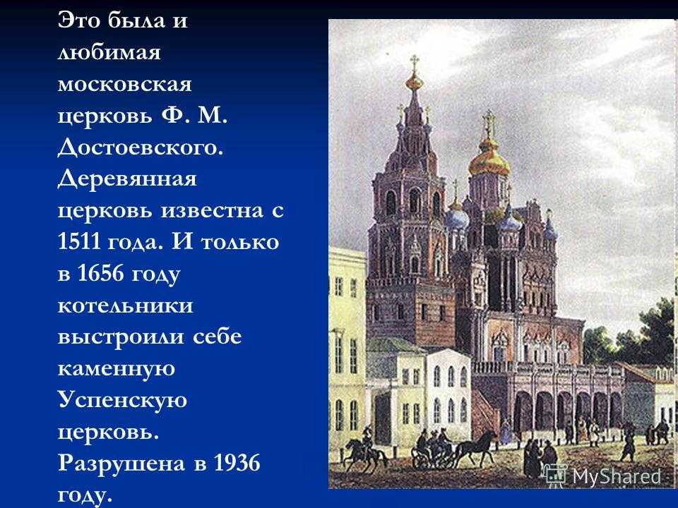 Это была и любимая московская церковь Ф. М. Достоевского. Деревянная церковь известна с 1511 года. И только в 1656 году котельники выстроили себе каменную Успенскую церковь. Разрушена в 1936 году.