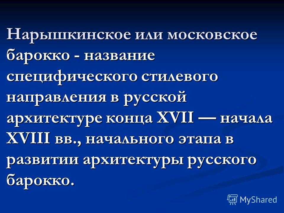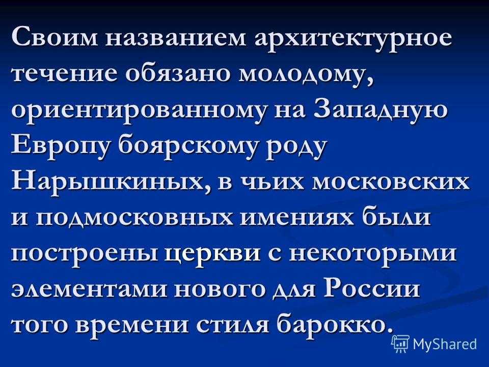 Своим названием архитектурное течение обязано молодому, ориентированному на Западную Европу боярскому роду Нарышкиных, в чьих московских и подмосковных имениях были построены церкви с некоторыми элементами нового для России того времени стиля барокко.