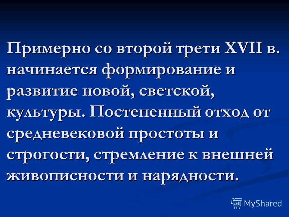 Примерно со второй трети XVII в. начинается формирование и развитие новой, светской, культуры. Постепенный отход от средневековой простоты и строгости, стремление к внешней живописности и нарядности.