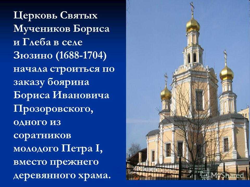 Церковь Святых Мучеников Бориса и Глеба в селе Зюзино ( ) начала строиться по заказу боярина Бориса Ивановича Прозоровского, одного из соратников молодого Петра I, вместо прежнего деревянного храма.
