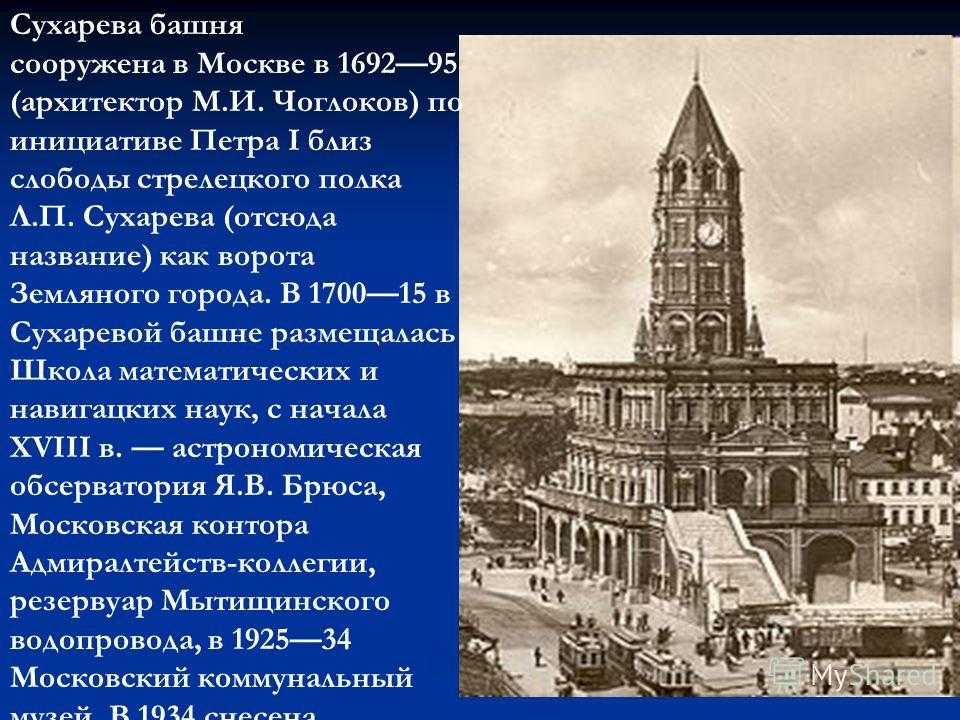 Сухарева башня сооружена в Москве в (архитектор М.И. Чоглоков) по инициативе Петра I близ слободы стрелецкого полка Л.П. Сухарева (отсюда название) как ворота Земляного города. В в Сухаревой башне размещалась Школа математических и навигацких наук, с начала XVIII в. астрономическая обсерватория Я.В. Брюса, Московская контора Адмиралтейств-коллегии, резервуар Мытищинского водопровода, в Московский коммунальный музей. В 1934 снесена.