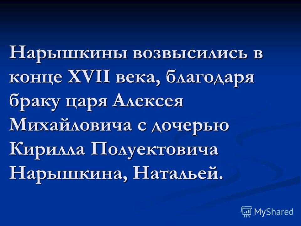 Нарышкины возвысились в конце XVII века, благодаря браку царя Алексея Михайловича с дочерью Кирилла Полуектовича Нарышкина, Натальей.