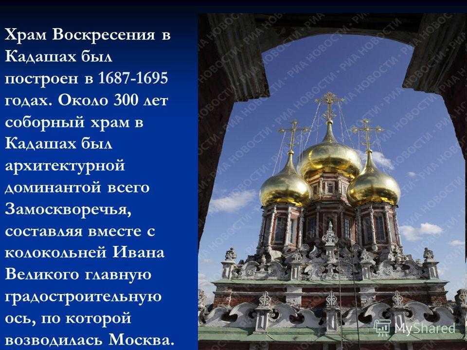 Храм Воскресения в Кадашах был построен в годах. Около 300 лет соборный храм в Кадашах был архитектурной доминантой всего Замоскворечья, составляя вместе с колокольней Ивана Великого главную градостроительную ось, по которой возводилась Москва.