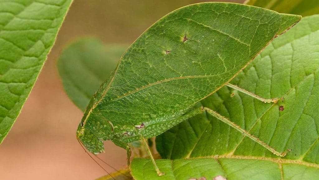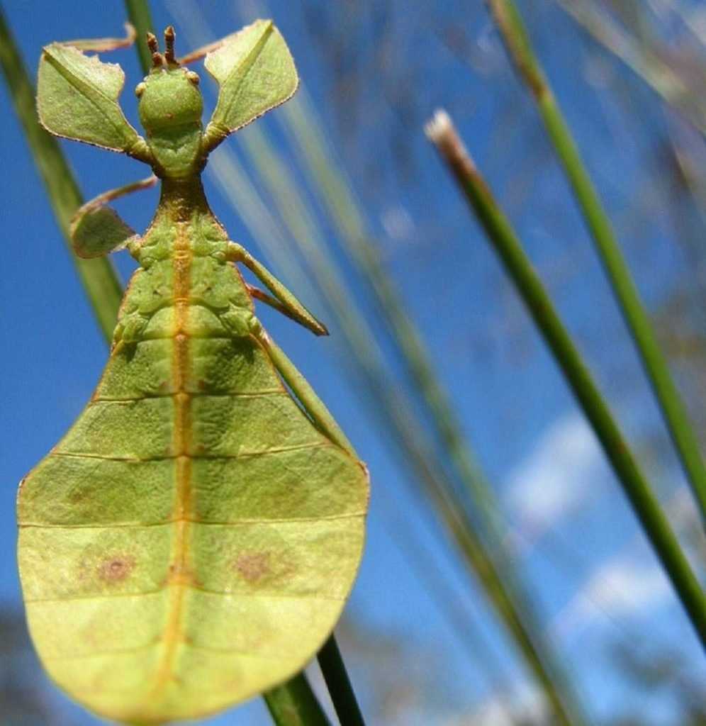 Ещё один экземпляр фауны, в котором сложно угадать представителя царства животных. При взгляде на это существо скорее можно подумать, что перед тобой небольшая частица растения. Он маскируется так искусно, что увидеть в зарослях зелёное тело практически невозможно. Сходство с листвой помогает ему избежать участи завтрака для многих пернатых, лягушек, змей и прочих природных врагов.