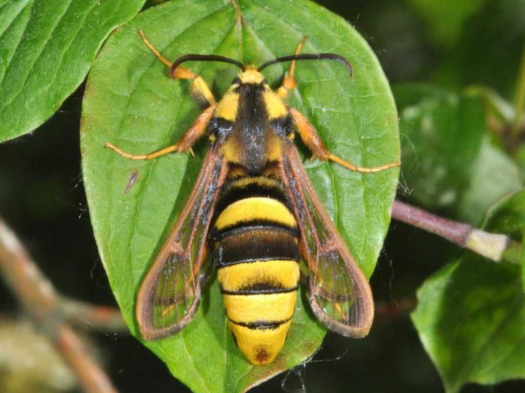 Бабочка пчеловидная стеклянница по внешним признакам напоминает осу. Прозрачные крылья и полосатое оранжево – черное брюшко создают характерный облик ядовитого насекомого, но у бабочки — стеклянницы отсутствует ядовитое жало.
