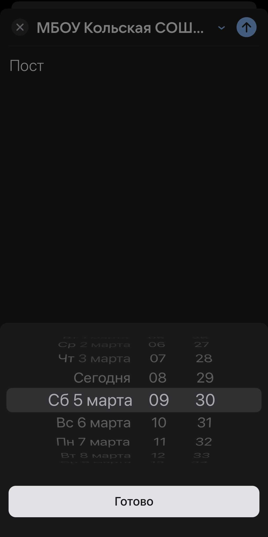 Далее внизу нажмите на кнопку «сейчас». В появившемся окне выставите желаемую дату и время публикации поста.