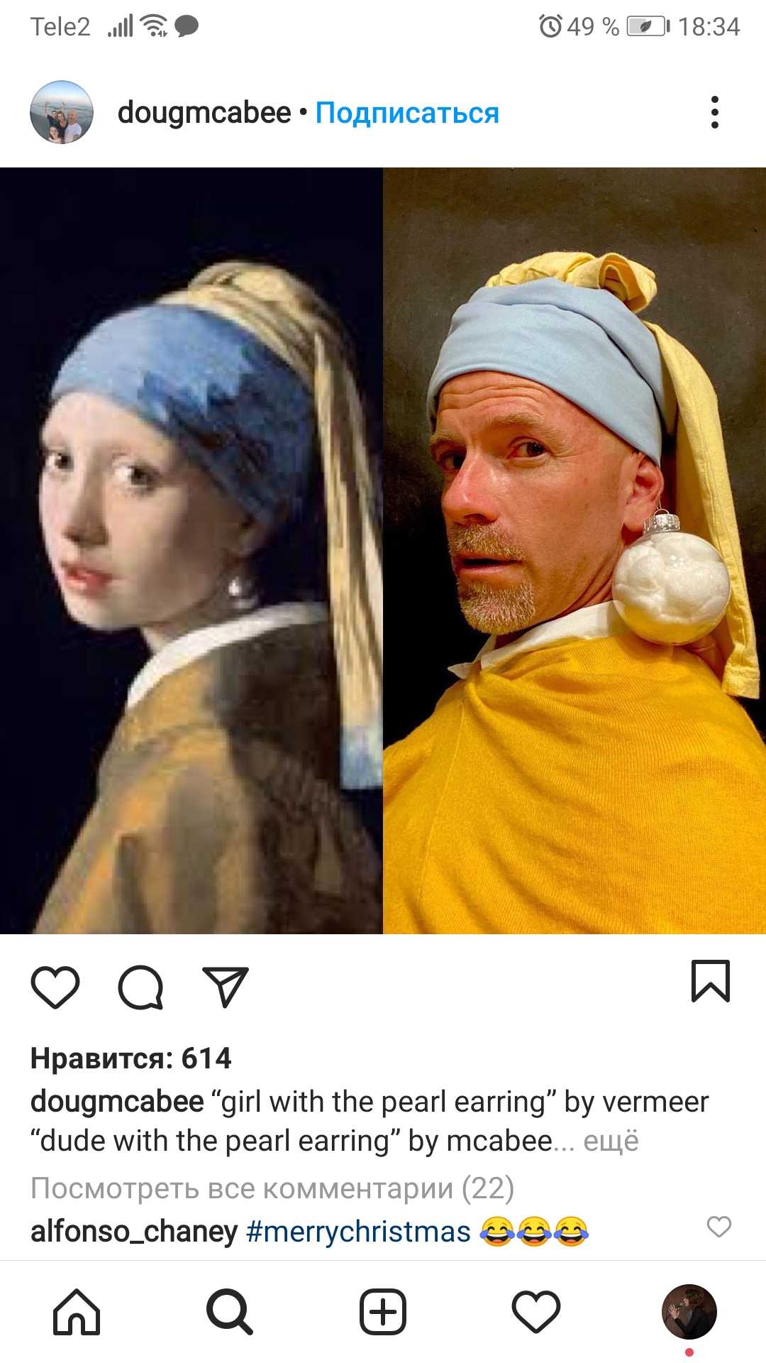 Попробуйте закосплеить какого-нибудь персонажа или шуточно повторить картину, а может, сцену из фильма. Для вдохновения посмотрите #museumchallenge — недавняя музейная акция, когда люди косплеили известные картины подручными средствами.