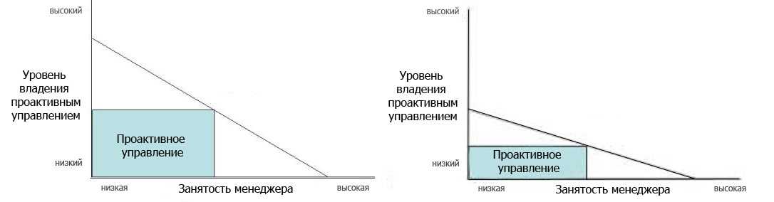 Однако некоторые менеджеры могут успешно справляться со своей работой даже при наличии некоторых проблем, т.е. проактивные качества оказываются сильнее негативных влияний. Из диаграммы ниже видно, что проактивное управление возникает на пересечении занятости менеджера и его способностью быть проактивным.