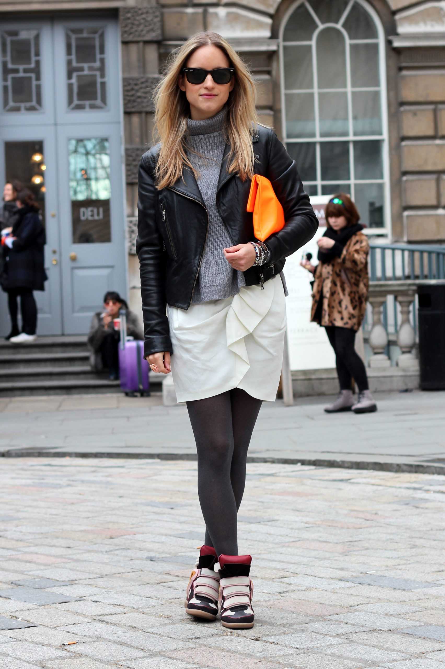 Очень модно зимние сникерсы смотрятся с узкими джинсами, леггинсами, вязаными платьями и любыми теплыми юбками (обязательный момент — под юбки, платья нужно надеть колготки с высокой плотностью). Особую женственность образу придает сочетание кроссовок на танкетке с платьем А-силуэта, при этом обувь должна быть однотонной или одной с одеждой расцветки.