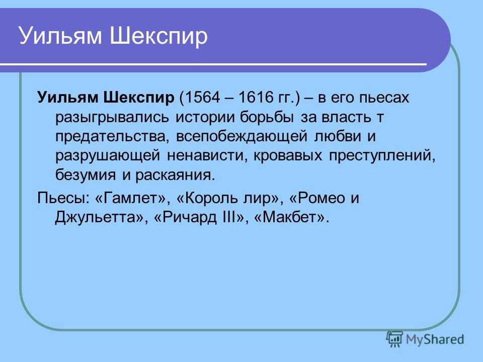 Уильям Шекспир (1564 – 1616 гг.) – в его пьесах разыгрывались истории борьбы за власть т предательства, всепобеждающей любви и разрушающей ненависти, кровавых преступлений, безумия и раскаяния. Пьесы: «Гамлет», «Король лир», «Ромео и Джульетта», «Ричард III», «Макбет». Уильям Шекспир