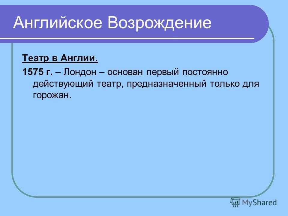 Театр в Англии г. – Лондон – основан первый постоянно действующий театр, предназначенный только для горожан. Английское Возрождение