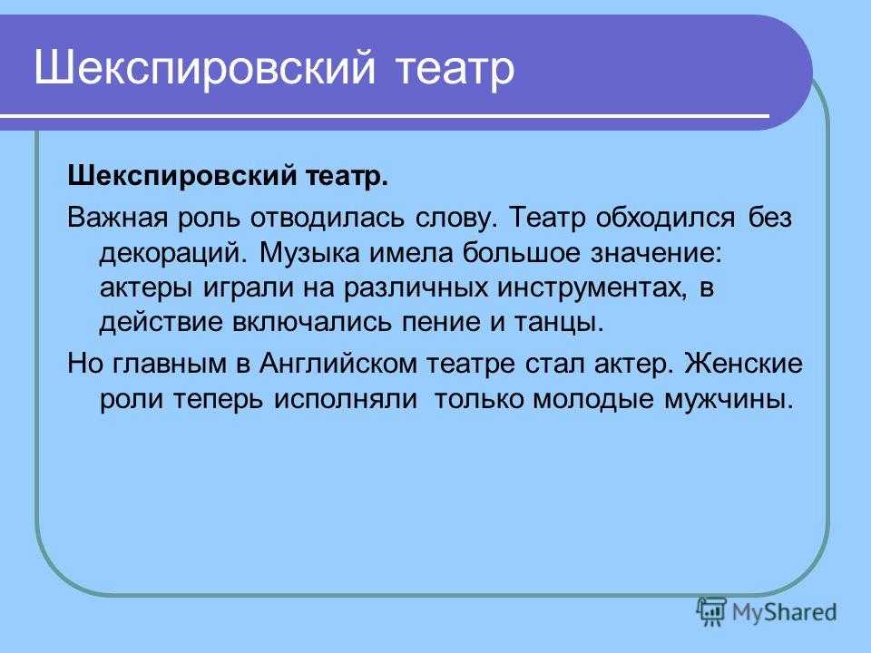 Шекспировский театр. Важная роль отводилась слову. Театр обходился без декораций. Музыка имела большое значение: актеры играли на различных инструментах, в действие включались пение и танцы. Но главным в Английском театре стал актер. Женские роли теперь исполняли только молодые мужчины. Шекспировский театр