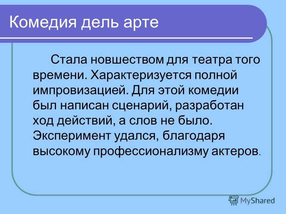 Стала новшеством для театра того времени. Характеризуется полной импровизацией. Для этой комедии был написан сценарий, разработан ход действий, а слов не было. Эксперимент удался, благодаря высокому профессионализму актеров. Комедия дель арте