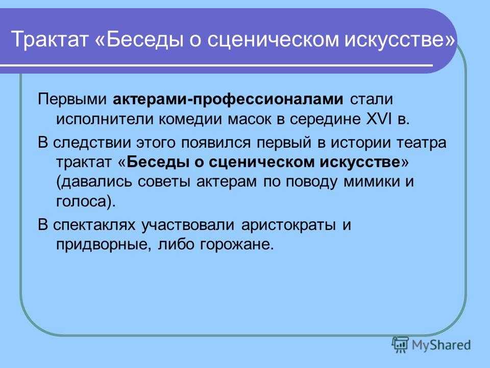 Первыми актерами-профессионалами стали исполнители комедии масок в середине XVI в. В следствии этого появился первый в истории театра трактат «Беседы о сценическом искусстве» (давались советы актерам по поводу мимики и голоса). В спектаклях участвовали аристократы и придворные, либо горожане. Трактат «Беседы о сценическом искусстве»