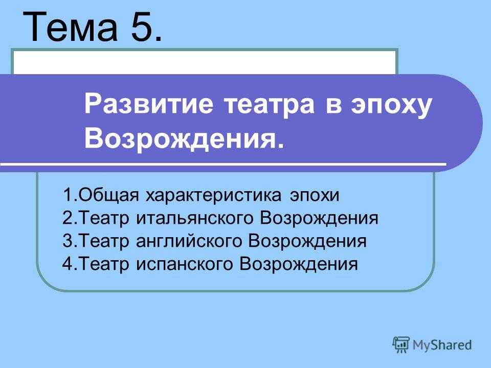 Презентация на тему: » Развитие театра в эпоху Возрождения. 1.Общая характеристика эпохи 2.Театр итальянского Возрождения 3.Театр английского Возрождения 4.Театр испанского Возрождения.» — Транскрипт: