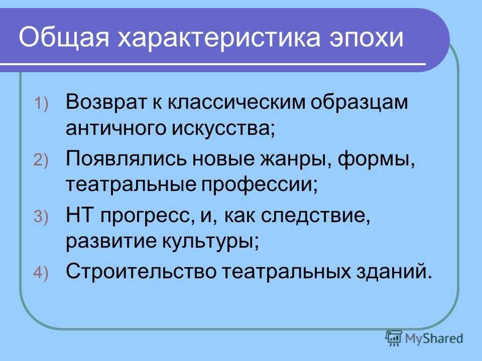 Общая характеристика эпохи 1) Возврат к классическим образцам античного искусства; 2) Появлялись новые жанры, формы, театральные профессии; 3) НТ прогресс, и, как следствие, развитие культуры; 4) Строительство театральных зданий.