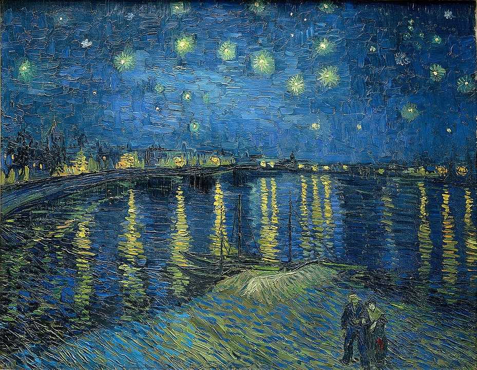 Ван Гог, кажется, был особенно очарован ночным небом и газовым освещением, видимым через воду в Арле. Он был достаточно взволнован этой картиной, чтобы передать ее своему другу, художнику Эжену Боху, эскизом, и эта работа была публично выставлена в 1889 году в Société des Artistes Indépendants в Париже.Он также описал картину почти с любовью в деталях в одном из многих писем, которые он написал своему брату Тео, описывая его как «… Звездное небо, нарисованное ночью, фактически под струей газа. Небо аквамариновое, вода королевского синего цвета, земля розовато-лиловая. Город синий и фиолетовый. Газ желтый, а отблески — красно-золотистые, переходящие в зелено-бронзовые. На аквамариновом поле неба Большая Медведица — искрящийся зелено-розовый, чья сдержанная бледность контрастирует с брутальным золотом газа. На переднем плане две красочные фигурки влюбленных ».