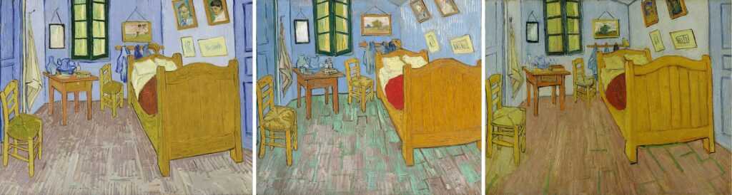 Это была спальня Ван Гога в «Желтом доме», которую он делил с Гогеном. Закрытая дверь слева вела в запасную спальню, в которой спал Гоген. В письме своему другу Винсент заявил, что оригинальная картина в этой серии появилась из-за продолжительного приступа болезни, во время которого он был прикован к постели в течение нескольких дней.Один маленький и приятный факт, который могут заметить зоркие наблюдатели, — это миниатюрные портреты, висящие рядом с кроватью. Это эквивалент 19-го века, когда на стене висели поляроиды ваших друзей — на фотографиях изображены современники и хорошие друзья Ван Гога Эжен Бох и Поль-Эжен Милье.
