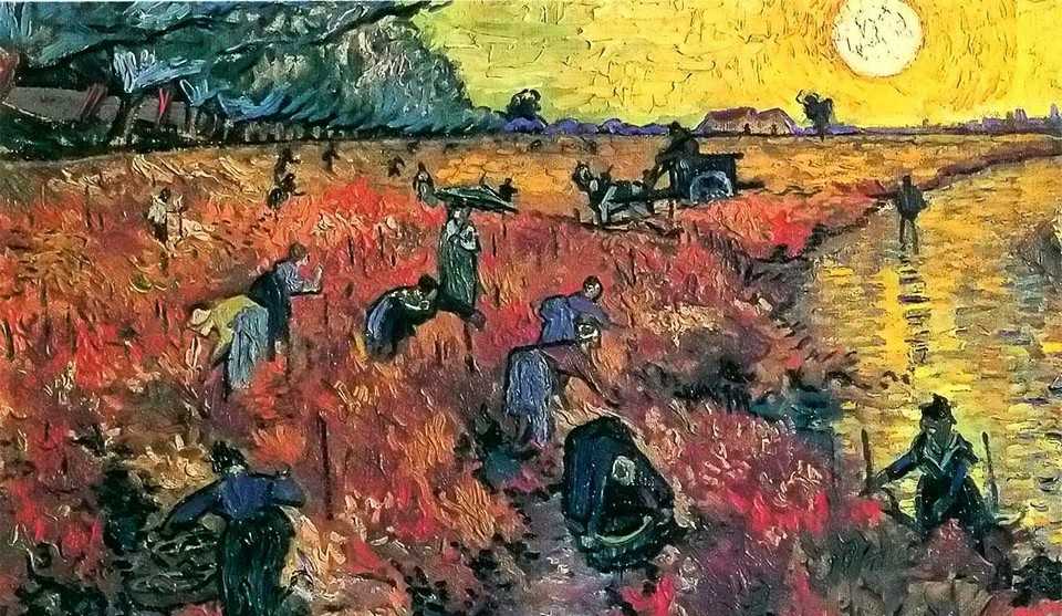 Знаменитое полотно датируется 1888 годом. Сюжет картины не выдуманный, о нем Винсент рассказывает в одном из посланий к Тео. На полотне художник передает поразившие его насыщенные цвета: густо-красные виноградные листья, пронзительно-зеленое небо, ярко-фиолетовая умытая дожем дорога с золотыми бликами от лучей заходящего солнца. Краски как будто перетекают одна в другую, передают тревожное настроение автора, его напряженность, глубину философские раздумий о мире. Такой сюжет будет повторяться в творчестве Ван Гога, символизируя вечно обновляющуюся в труде жизнь.